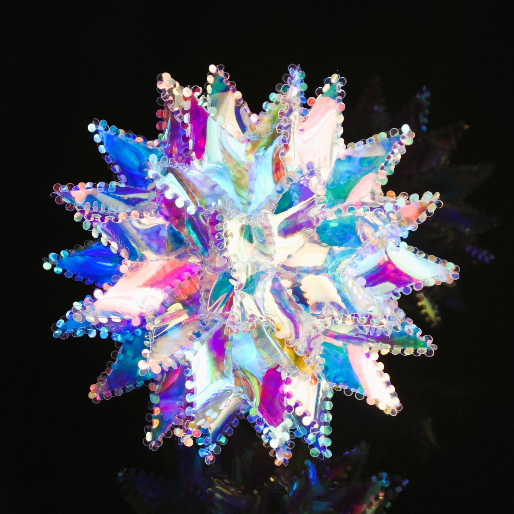 Based on a panel modeled after the second golden rhombus (with a diagonal ratio of φ ≈ 2.618...), this kit challenges you to create a shape carefully selected from the 358,833,072 possible stellations of the rhombic triacontahedron. Enjoy the non-periodic beauty and organic curves hidden in nature! The curved edges dynamically change color and sparkle.